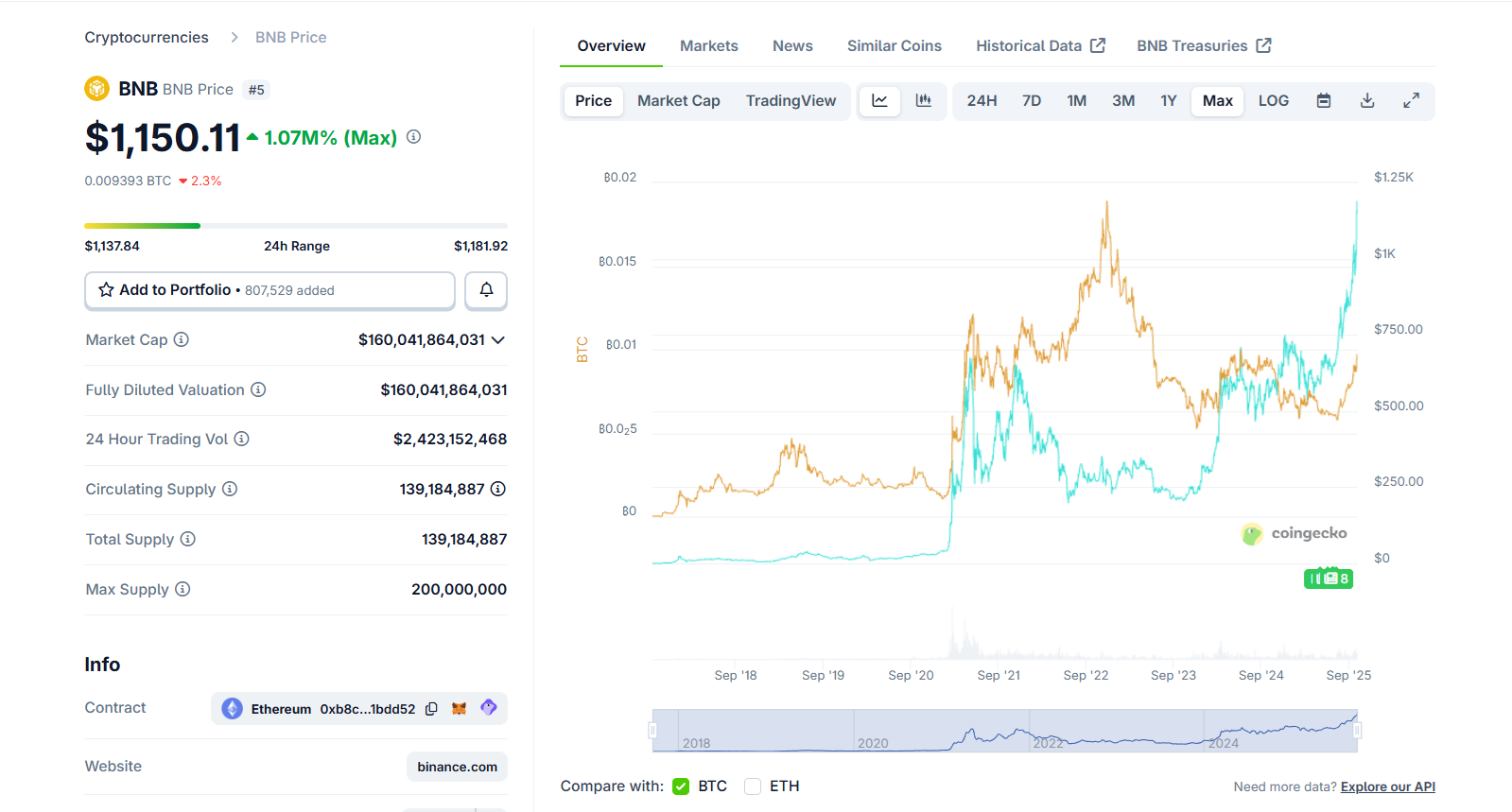 BNB/USD (cyan line) and BNB/BTC (golden) historical price, CoinGecko snapshot, October 5, 2025, at 02:05 UTC.